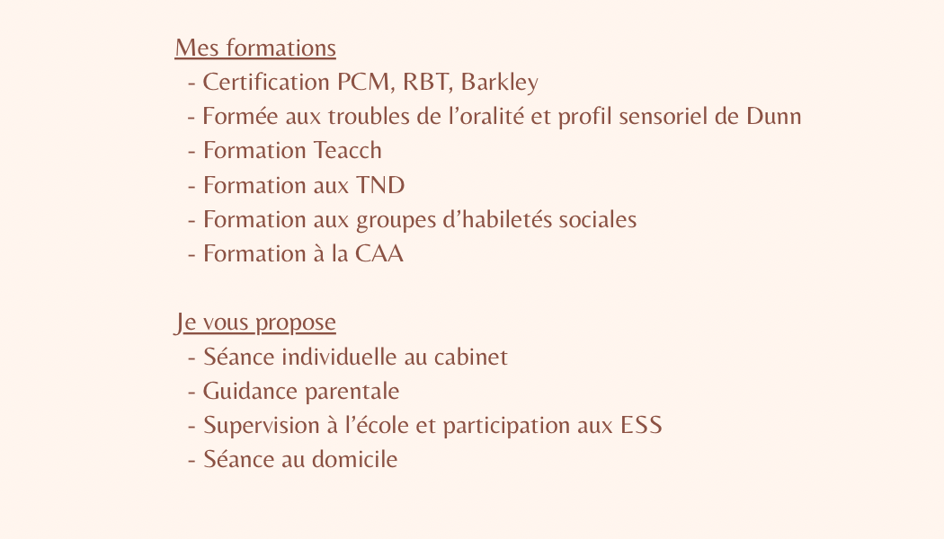 Type(s) d'intervention proposée(s) Intervention sur la communication (PECS, Makaton,...), Intervention cognitivo-comportementale (ABA,...), Education structurée (TEACCH,...), Entraînement individuel aux habiletés sociales, Groupe fratrie, Guidance parentale, Groupe d'habiletés sociales